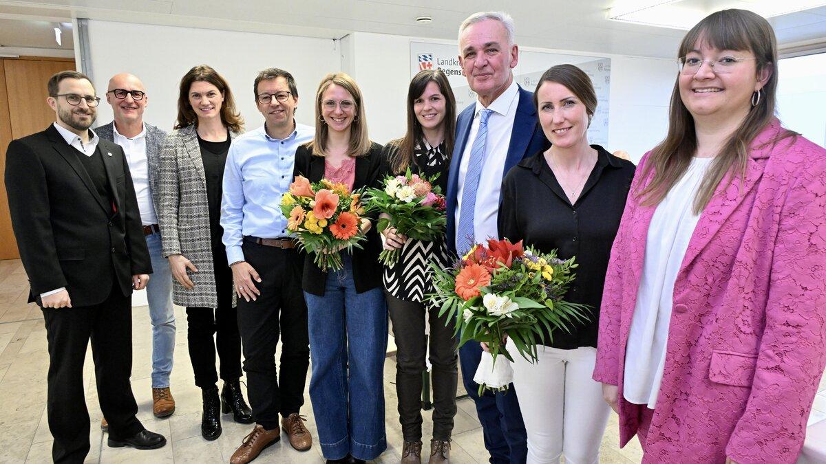 Landrätin Tanja Schweiger bei der Preisübergabe mit (v.r.): Hr. Weiß von der Wirtschaftsförderung Landkreis Regensburg, Prof. Dr. Sean Patrick Saßmannshausen, Leiter des Start-up Centers der OTH Regensburg, Fr. Rank vom Sachgebiet Wasserrecht und Gewässerschutz, Staatliches Abfallrecht und Bodenschutz Landkreis Regensburg, sowie Wolfgang Voigt, Projektkoordinator Gründungs-Hub Ostbayern